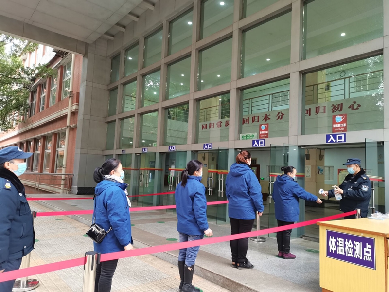 演練開始,學生公寓值班工作人員認真組織“學生”有序排隊進入公寓大門,另一位值班人員手持額溫槍,對“學生”進行體溫檢測。