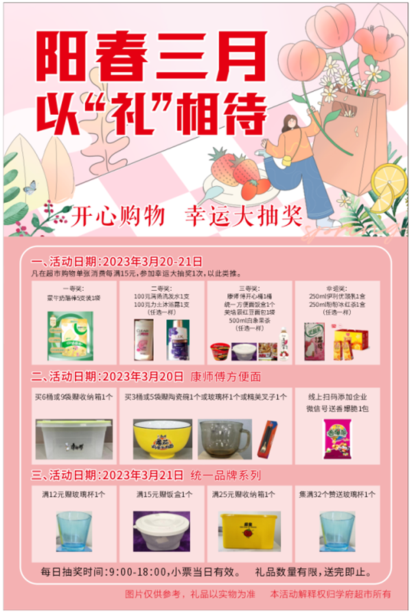 為豐富校園生活,讓利師生,3月20-21日,安全與后勤保障部經(jīng)營(yíng)管理中心在學(xué)府超市一、二店開(kāi)展了為期兩天的“陽(yáng)春三月,以禮相待”開(kāi)心購(gòu)物抽獎(jiǎng)促銷(xiāo)活動(dòng)。