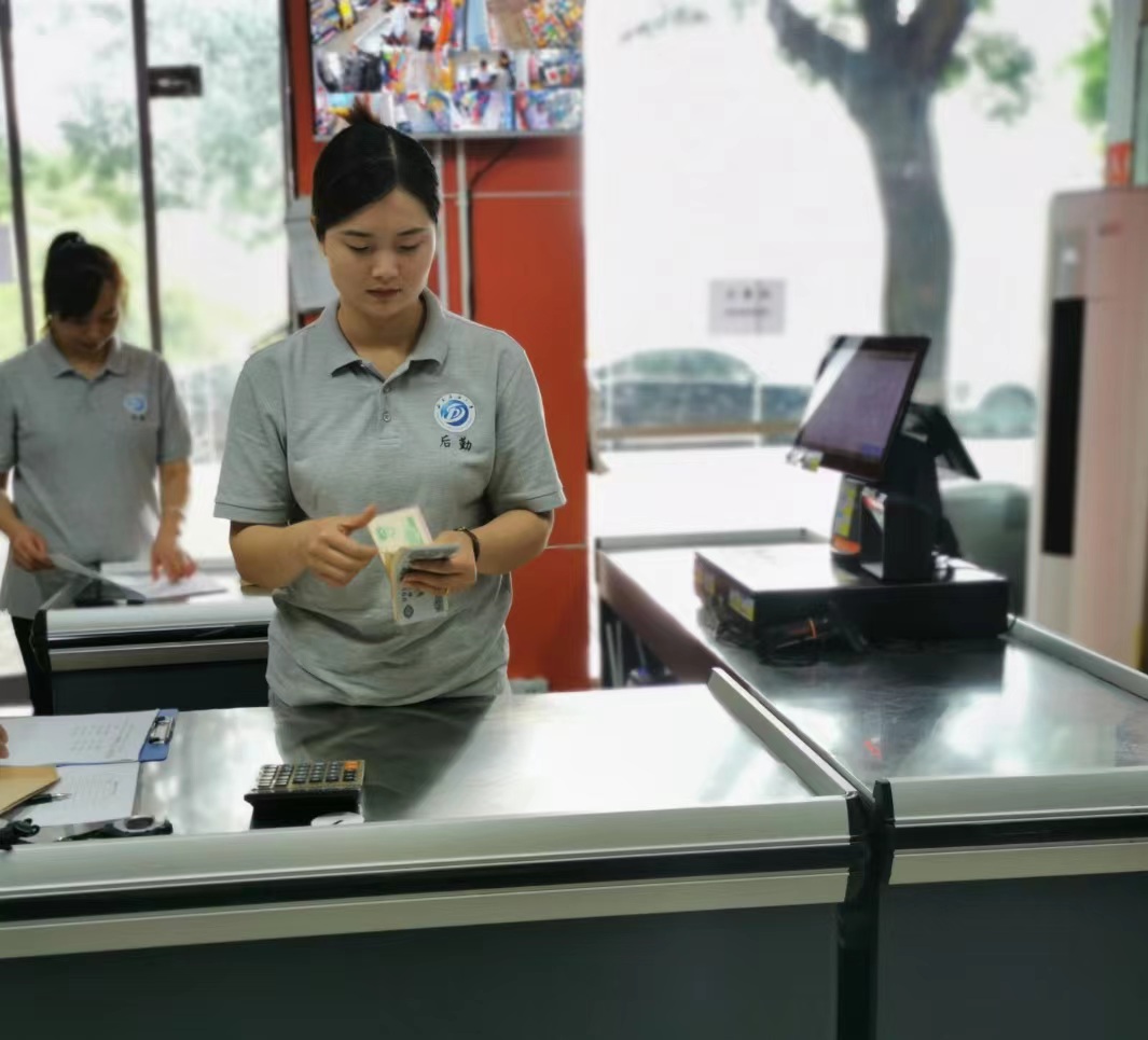 參加本次比賽的選手一共有9位,每位選手依次進行“收銀服務標兵、點鈔高手、專業找茬”三個比賽項目。收銀服務標兵項目主要考察選手們的收銀操作熟練度、服務禮儀規范、收銀速度等收銀必備知識和作業流程;點鈔高手項目則考察選手的點鈔速度、準確度;專業找茬比賽項目主要考察選手的商品陳列規范掌握程度,選手要在1分鐘內找出陳列不符合規范的商品并糾正。