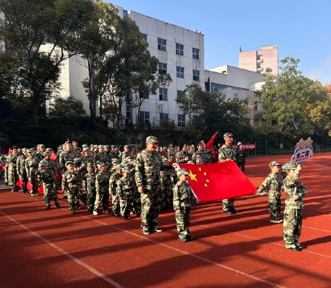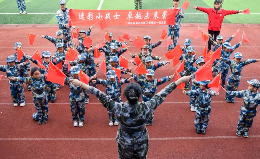 南充校區(qū)國旗護衛(wèi)隊邁著整齊劃一的步伐護送國旗入場,全體人員肅立,升國旗、奏唱國歌、行注目禮,活動正式開始。家長和孩子們身著迷彩服,喊著響亮的口號,邁著矯健的步伐,昂首闊步地從主席臺前一一列隊走過。