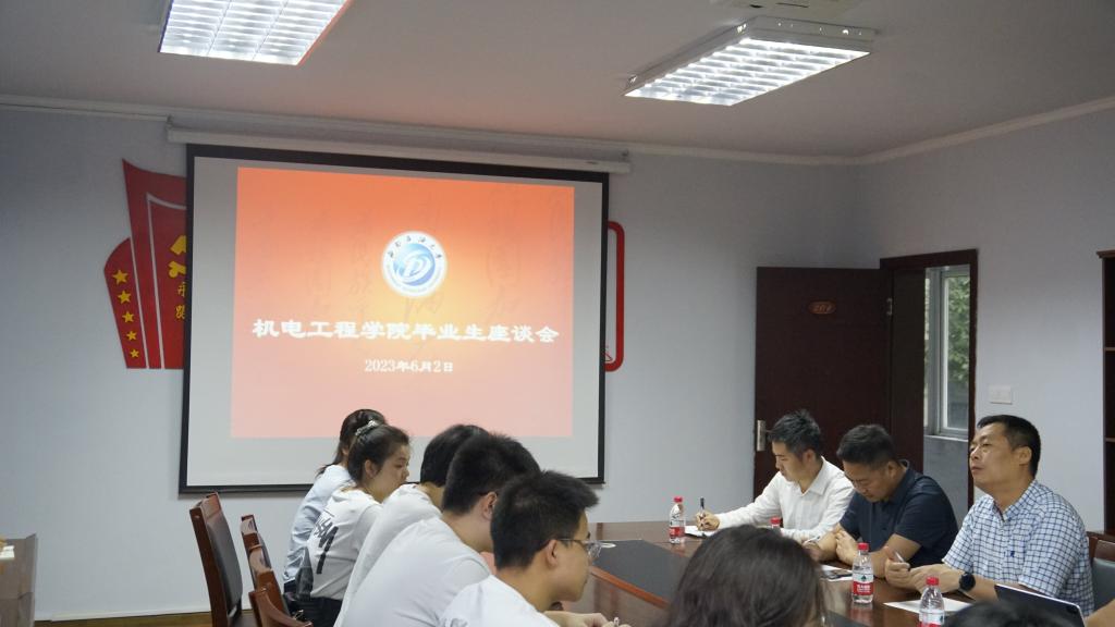 6月2日,機電工程學院在完井樓201召開畢業生座談會。機電工程學院黨委書記李忠偉,黨委副書記、院長韓傳軍,黨委副書記、紀委書記姚偉寧,副院長石明江參加會議。會議由機電工程學院副院長蔡燦主持,機電學院學生工作辦公室(團總支)副主任許露之,畢業班輔導員,畢業班學生代表和全體學生黨員參加座談會。