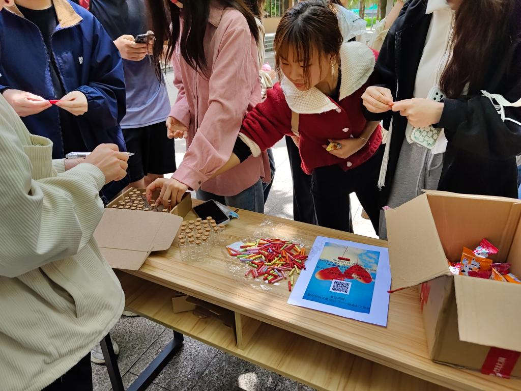 5月11日,機電工程學院在龍井雅苑門口開展了“心理知識線下答題暨心語心愿漂流瓶”活動。本次活動面向校區全體學生,共計140人參與。