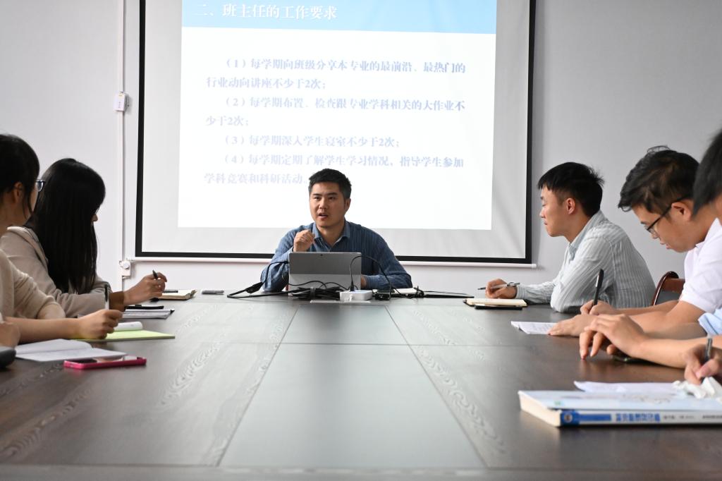 蔡燦指出,班主任應(yīng)按照“學(xué)力輔導(dǎo)、思維引導(dǎo)、心理疏導(dǎo)、生活指導(dǎo)”的基本要求,教育引導(dǎo)學(xué)生樹立正確的學(xué)習(xí)目標(biāo),端正學(xué)習(xí)態(tài)度、堅定專業(yè)思想、提升科研能力。就進(jìn)一步做好學(xué)科班主任工作,他要求,一是要關(guān)心了解學(xué)生的學(xué)習(xí)情況,引導(dǎo)學(xué)生掌握科學(xué)的學(xué)習(xí)方法,有意識地培養(yǎng)學(xué)生的創(chuàng)新精神和實(shí)踐能力,引導(dǎo)學(xué)生專業(yè)成才。二是要幫助學(xué)生樹立正確的人生觀和價值觀,教育學(xué)生樹立刻苦學(xué)習(xí)的精神和嚴(yán)謹(jǐn)?shù)闹螌W(xué)態(tài)度,引導(dǎo)學(xué)生注重自身綜合素質(zhì)發(fā)展。三是要根據(jù)自身工作和班級特點(diǎn)制定工作計劃,不斷提高班主任工作的質(zhì)量和效率。(機(jī)電工程學(xué)院/彭星宇 朱晨磊 黃冉 龍鑫)