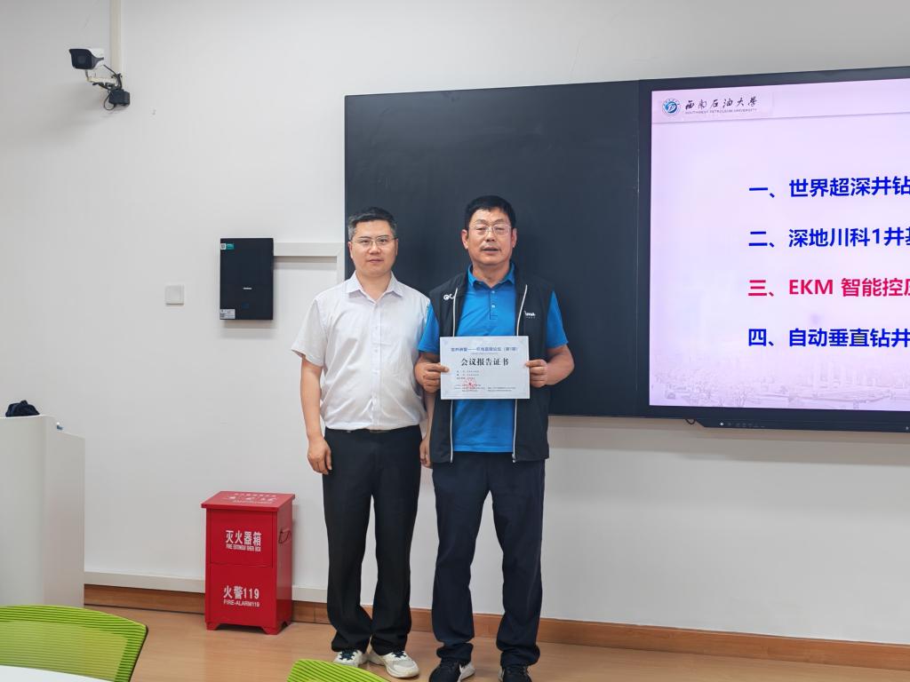任濤教授以“從玩到學術研究-我的大學生活”為題,結合自身本碩博求學經歷,分享了如何將興趣轉化為科研動力,并圍繞管道機器人研發、學術成果轉化等展開論述。作為西南石油大學首屆“飛翔獎學術科技獎”獲得者,他深耕油氣智能裝備領域,研發的管道機器人已廣泛應用于多領域。聶榮國副教授則以“深地鉆井技術”為核心,系統解析了復雜地層鉆井技術難題及解決方案,其團隊在柔性鉆具組合強度分析等方面取得突破性成果,為深地工程安全高效作業提供了理論支撐。活動結束后,蔡燦代表學院為任濤教授和聶榮國副教授頒發了會議報告證書。