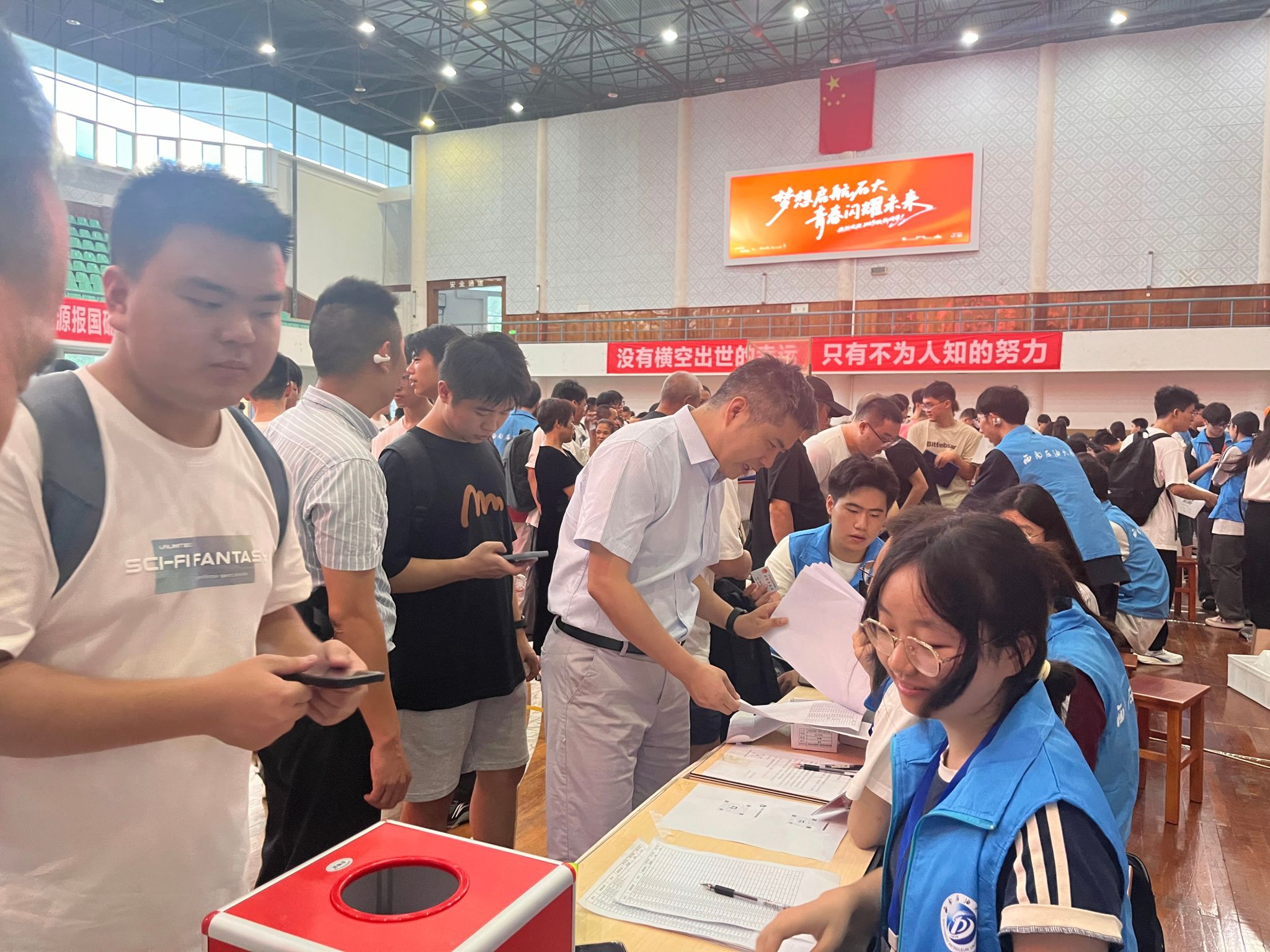 機(jī)電院在體育館內(nèi)設(shè)置新生報到處,組織志愿者團(tuán)隊協(xié)助新生完成身份核驗、材料提交等流程;圍繞新生關(guān)心的課程學(xué)習(xí)、生活須知等問題答疑;現(xiàn)場還準(zhǔn)備了實用扇子和學(xué)院宣傳冊的迎新禮包,并設(shè)有抽獎環(huán)節(jié),以輕松方式拉近彼此距離。此外,學(xué)院精心策劃了多元迎新活動,設(shè)置多處打卡點(diǎn),幫助新生快速融入校園。如體育館“請留下你的笑臉”的鼓勵新生通過自畫像傳遞正能量;宿舍樓下的“請與我擊掌”以跨越時空的擊掌傳遞溫暖與鼓勵地質(zhì)樓以“我在機(jī)電工程學(xué)院很想你”網(wǎng)絡(luò)熱梗標(biāo)語,讓新生直觀感受實驗室科創(chuàng)氛圍。機(jī)電院副院長蔡燦親臨迎新現(xiàn)場,與學(xué)生及家長親切交談介紹學(xué)院概況和學(xué)習(xí)內(nèi)容,鼓勵同學(xué)們積極融入校園、適應(yīng)大學(xué)生身份。