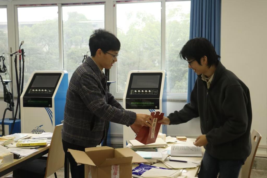 當天,學院副院長周培山、材料化學專業教研室老師曹藝軒、輔導員唐成玉、謝青洗代表學院去到了焊接技術與材化學專業的考研自習室,慰問考研學子,為備考的同學們送上了考研慰問禮包,禮包中包含著學院精心設計的明信片、文具等,每一張繪滿祝福的明信片,都承載著對同學們的美好祝愿。此外,學院還在考研慰問點設置了娛樂活動,提供了投飛鏢,繞口令等趣味游戲,讓同學們在緊張的學習生活中增添了一份樂趣。
