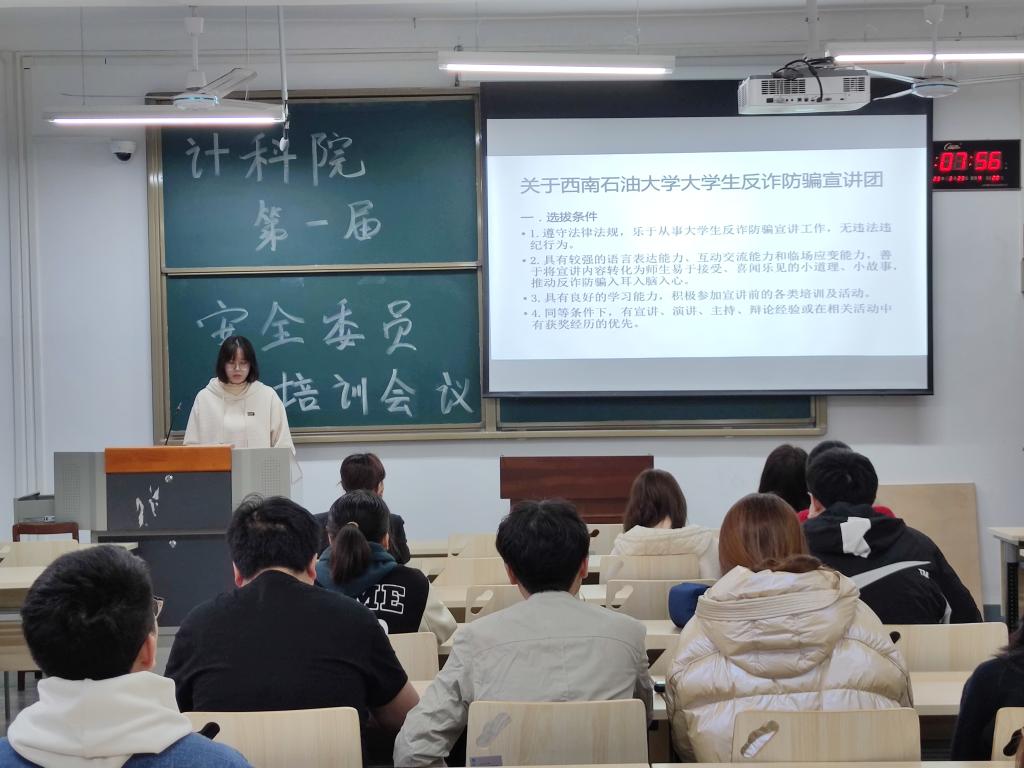 為進一步加強學院安全工作管理,增強學生安全責任意識,3月23日,計算機科學學院開展了主題為“安全重于泰山,防微杜漸保安全”安全委員培訓會。本次培訓由學院學生工作辦公室(團總支)主任胡丹主持,學院全體安全委員參加。