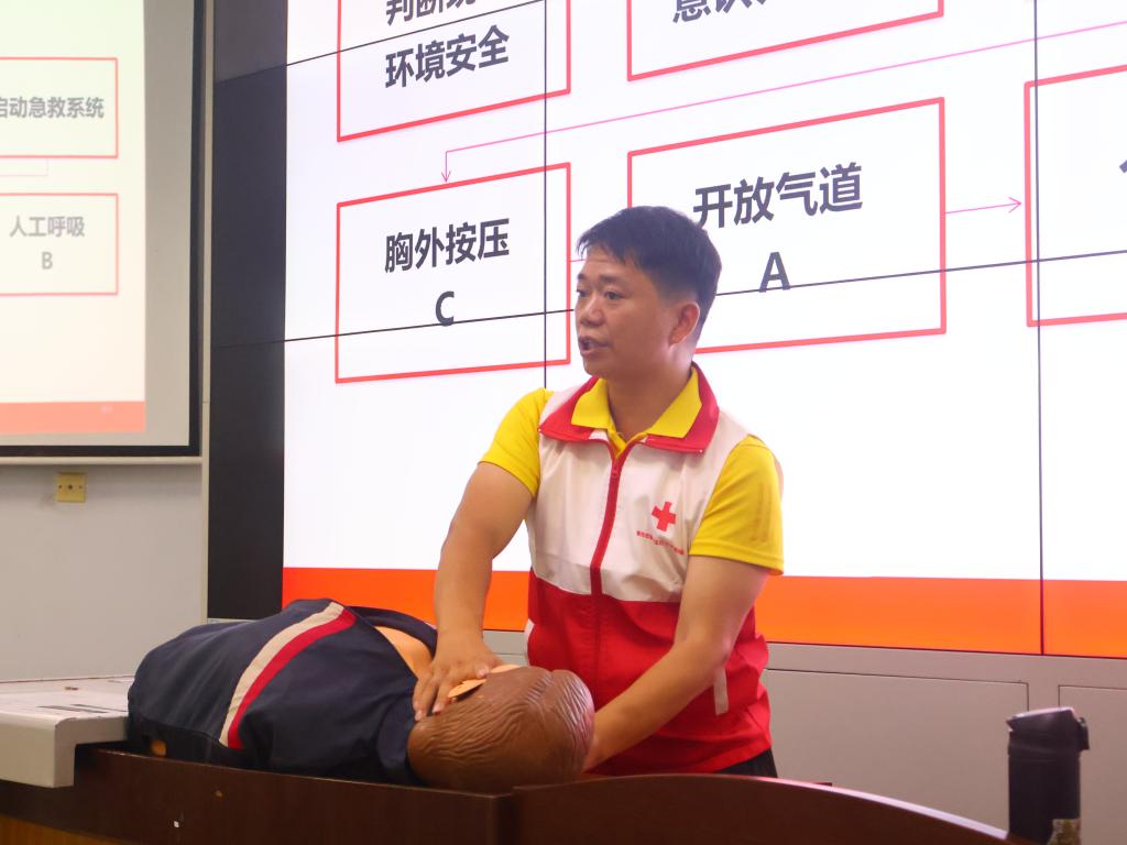 培訓會上,派燚借助視頻案例、圖文資料、人體模型詳細講解了心肺復蘇(CPR)的重要性和操作步驟,同時隨機抽取同學上臺演示。同時向參訓人員教授了止血和包扎的各種方法以及其他常用急救技能,讓學員們更好地掌握急救知識,確保在緊急情況下能熟練操作。