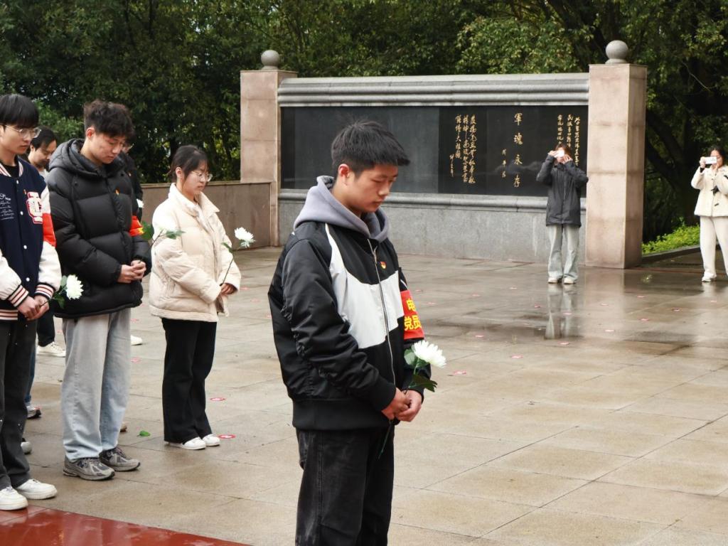 在莊嚴的烈士紀念碑前,師生們整齊列隊,團學干部帶領大家齊唱國歌,隨后默哀追念。接著,丁孟揚老師號召同學們要銘刻歷史印記、筑牢信仰根基、追尋紅色坐標。講話結束,全體師生向革命先烈敬獻鮮花,表達對革命先烈的無限崇敬和緬懷之情。