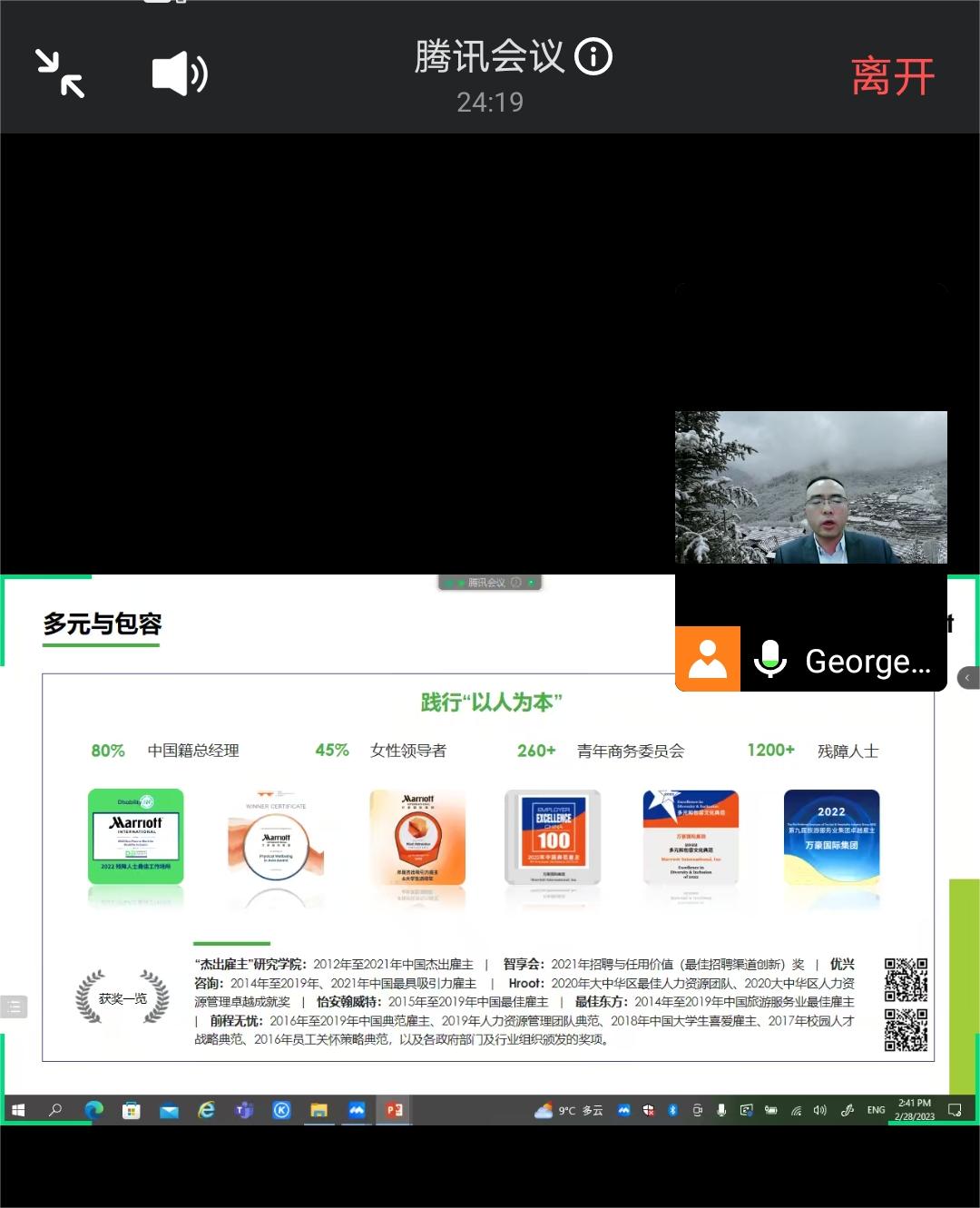 為進一步對未就業畢業生開展有效的就業指導和服務工作,精準提供優質管培崗位,3月2日下午,經管學院攜手萬豪集團麗思卡爾頓隱世酒店舉辦了企業專場空中宣講會。此次空中宣講會邀請到了酒店方人力資源總監居勇擔任宣講人,宣講會由輔導員甘麒主持,酒店管理2019級畢業生在線參加了此次會議。