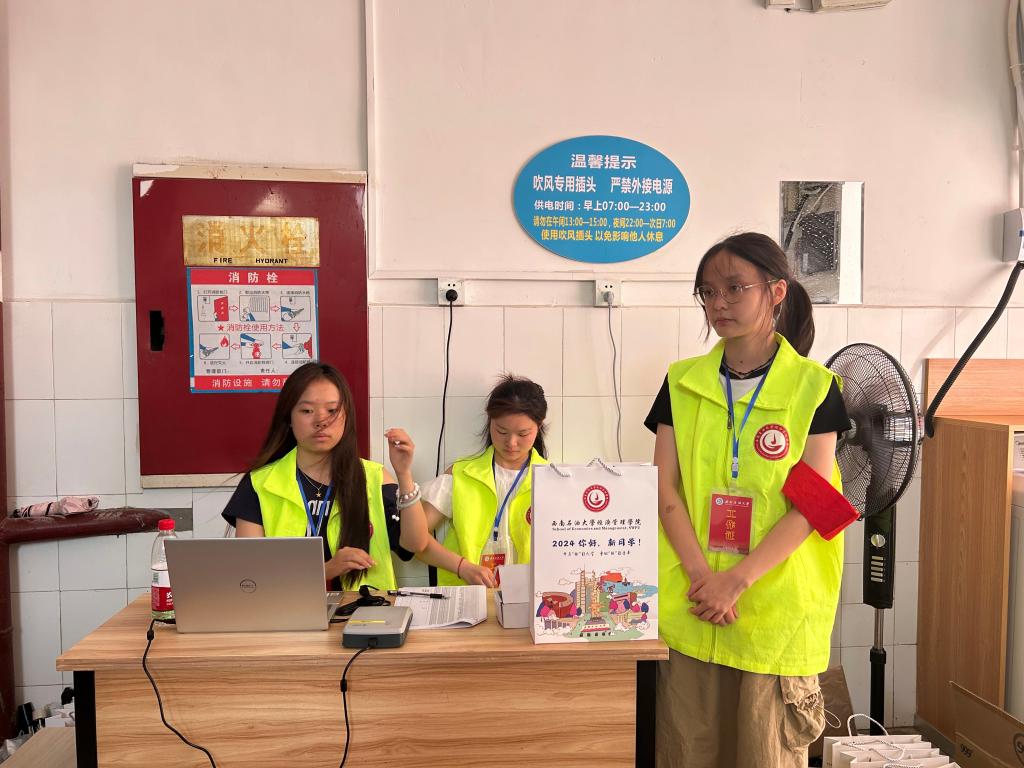 新生報(bào)到點(diǎn),志愿者團(tuán)隊(duì)身著統(tǒng)一制服,為新生提供入學(xué)登記、行李搬運(yùn)等多方位服務(wù)。學(xué)院特意為每位新生準(zhǔn)備了防暑禮包、冰凍飲料、防暑藥品、學(xué)院定制鑰匙扣等物資。彭雙叮囑大家天熱注意防暑,關(guān)注身體健康,同時(shí)也激勵(lì)大家盡快調(diào)整狀態(tài),適應(yīng)大學(xué)生活,與同學(xué)們?nèi)谇⑾嗵帯?/span>