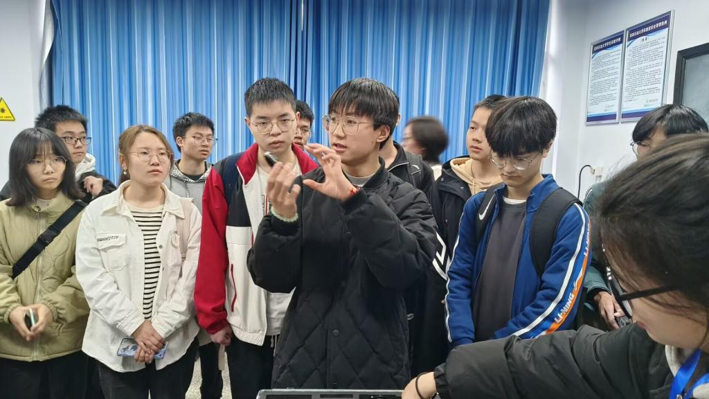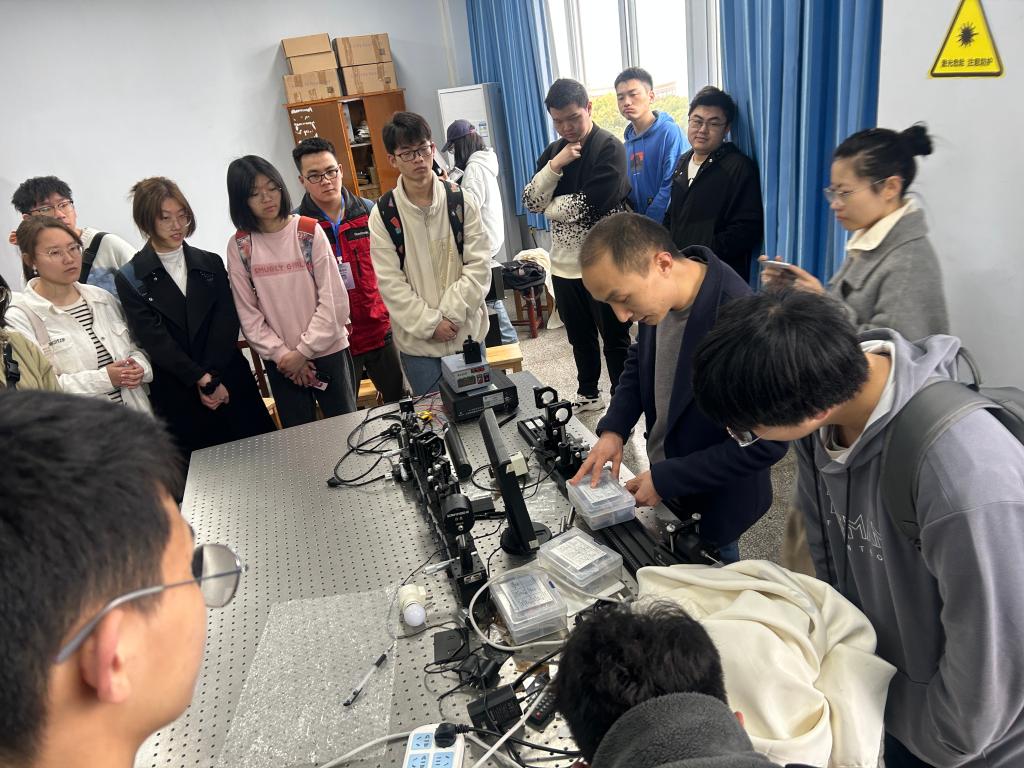 在老師們的帶領下,2022級同學們分別參觀了物理實驗室和光電實驗室。在物理實驗室,劉忠華主要向同學們介紹了實驗室開設的密立根油滴實驗、理想氣體狀態方程實驗和楊氏模量測量實驗,讓同學們零距離感受到了物理學科的魅力。在光電實驗室,老師和學長們分別為2022級同學們講解了應用光學實驗、線陣ccd測徑實驗、光學三維攝像與顯示綜合實驗和邁克爾遜干涉實驗,并著重講解了晶體聲光調制語音傳輸實驗,現場演示在驅動源輸入端加入外調制信號通過聲光效應達到控制激光輸出特性的過程。激發了同學們濃烈的興趣,使其深切體驗學科的魅力。參觀完實驗室,同學們還參觀了往屆全國大學生光電設計競賽的獲獎作品。