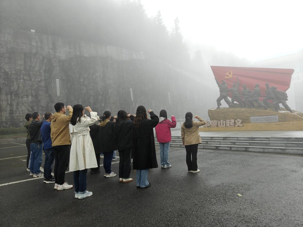 華鎣山起義雕塑前,全體黨員在南充校區教工黨支部書記范莉的帶領下,舉起右拳,重溫入黨誓詞。鏗鏘有力的錚錚誓詞,使在場每位黨員再次體會到了作為一名共產黨員的責任感和使命感,堅定了每一位黨員永遠跟著黨走的信心和決心。
