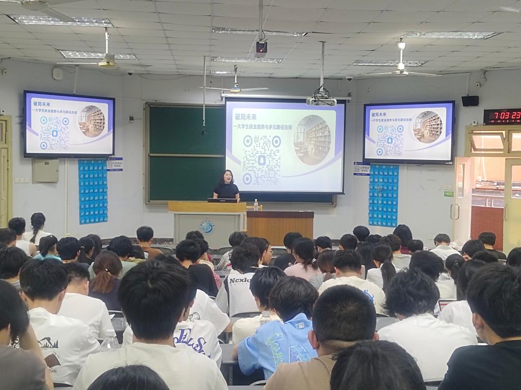 講座中,彭莉洪結合自身豐富的行業經驗與市場洞察,深入剖析了當下大學生就業形勢。她以大量的數據和生動的案例,詳細解讀了電子信息、人工智能、大數據等新興領域崛起帶來的就業新機遇,同時也指出傳統行業轉型升級對人才技能的新要求。針對大學生普遍存在的就業困惑,彭總監從簡歷制作、面試技巧、職業規劃等方面給予了實用的指導建議,強調大學生要注重提升自身的綜合能力與專業素養,主動適應市場需求變化?;迎h節中,同學們積極提問,就實習選擇、職業發展路徑等問題與彭總監展開熱烈交流,現場氛圍十分活躍。