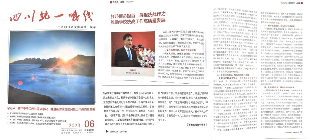 近日,在由中共四川省委統戰部主辦的《四川統一戰線》2023年第6期中,“書記講壇”欄目以《扛起使命擔當 展現統戰作為 推動學校統戰工作高質量發展》為題刊發了我校黨委書記張烈輝署名文章。