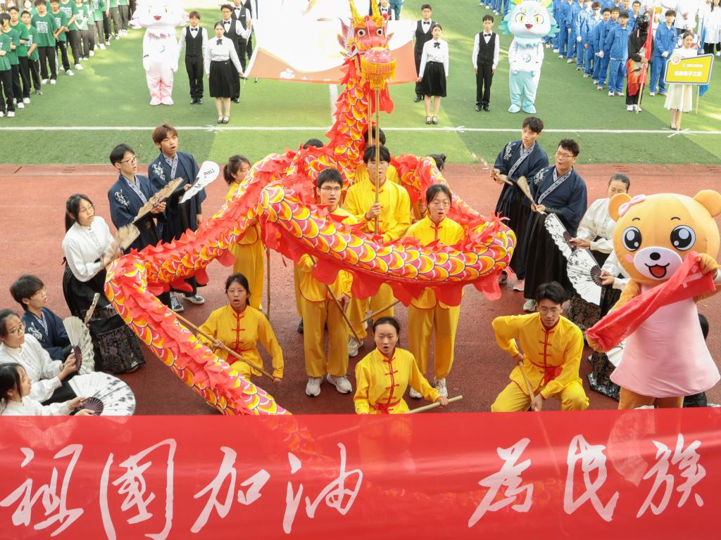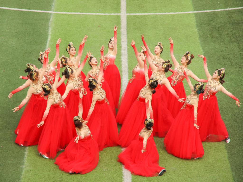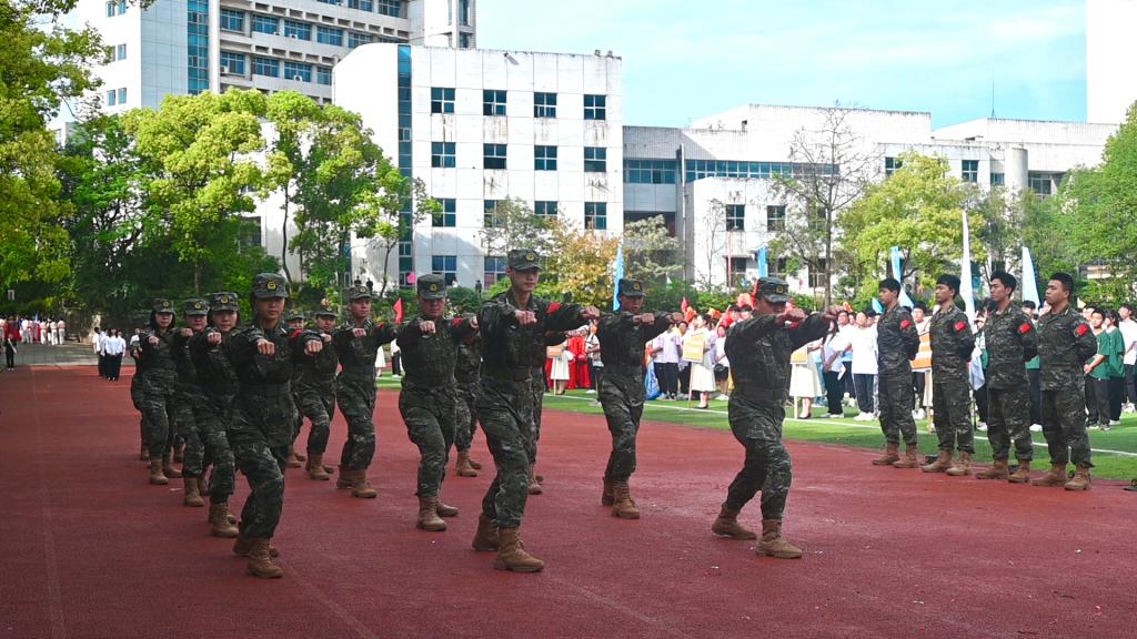 西柚老兵方隊表演了倒功、擒拿拳、刺殺操,動作干凈利落,一氣呵成,彰顯出軍人的龍虎聲威和青年大學生的熱血剛毅。由校區優秀中華傳統文化傳承創新基地帶來的戲曲舞蹈《潮起東方》巧妙地將傳統戲曲與現代舞蹈融為一體,舞者們身著鮮艷的紅衣,在悠揚的音樂聲中翩翩起舞,舞姿優美動人。大型綜合雜技表演節目《勇士》,將力量與美學完美結合,在疊起的鐵圈中穿梭自如,每一次飛躍都讓人驚嘆不已。