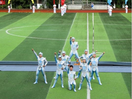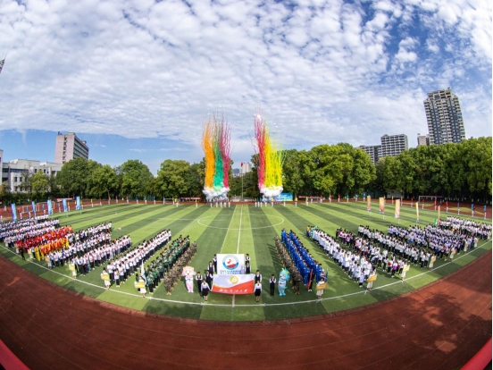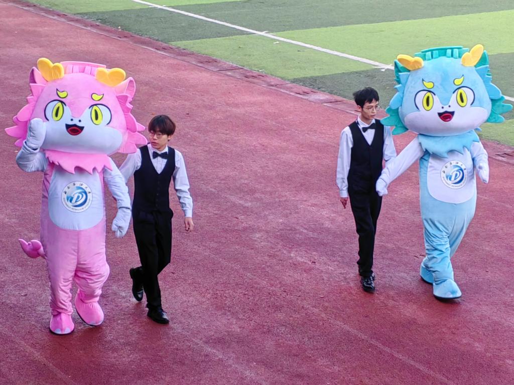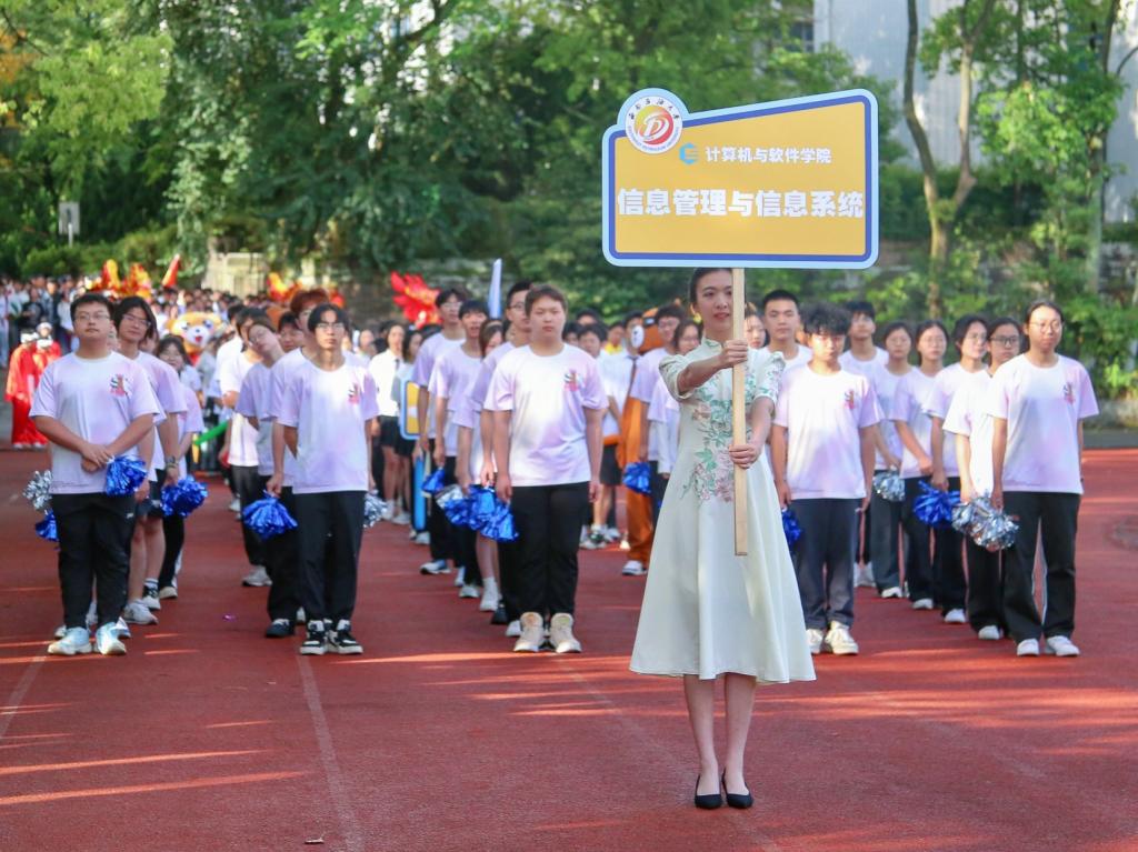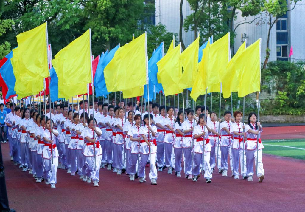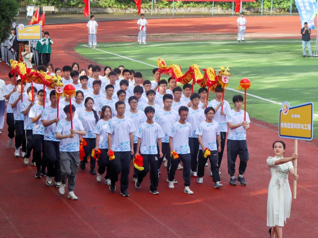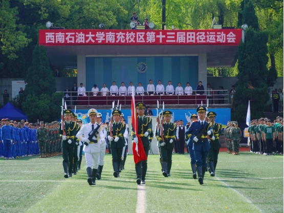 伴隨著鏗鏘的運動員進行曲,國旗護衛隊護衛鮮艷的五星紅旗率先入場,隨之校旗方隊、運動會會旗隊、吉祥物龍娃、龍妞和彩旗隊依次進場,18支專業代表隊、西柚老兵方隊和教職工代表隊步伐矯健地通過主席臺。隨后,舉行了莊嚴的升國旗儀式。