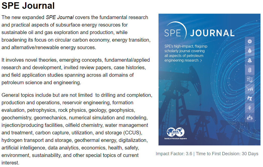 《SPE Journal》是SPE協會旗艦期刊,為國際石油天然氣工程領域頂級期刊,在石油工程領域擁有重要的學術影響力。期刊影響因子為3.602,位列JCR分區一區。該期刊主要涵蓋石油與天然氣勘探、鉆井與完井、開發和生產、能源轉型、可再生能源、碳捕集利用與封存(CCUS)、氫能、地熱、人工智能等領域的基礎和應用創新研究。