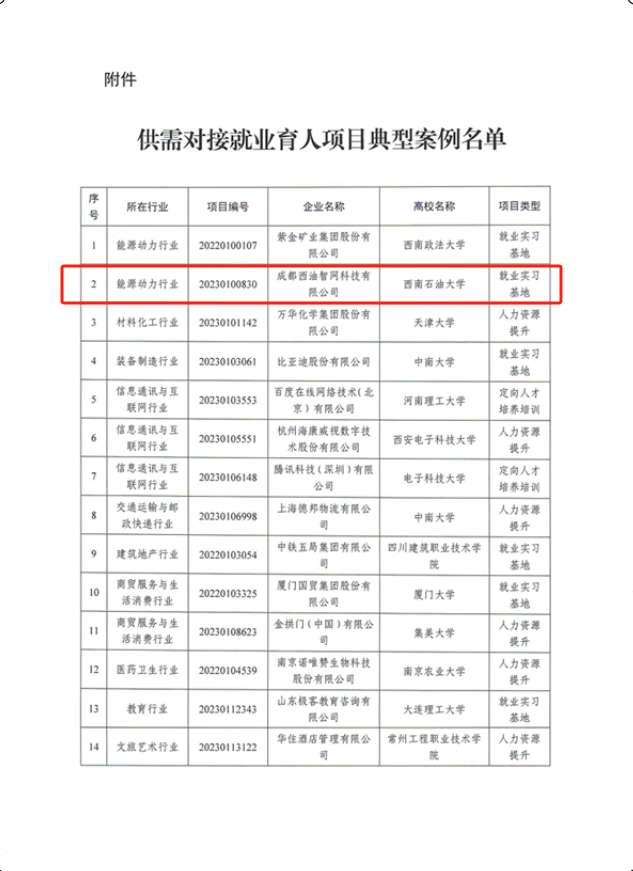 9月30日,教育部公布供需對接就業育人項目典型案例名單,我校與成都西油智網科技有限公司合作的“校企協同實踐育人平臺的建設與構建”項目入選,全國僅18個典型案例項目入選。
