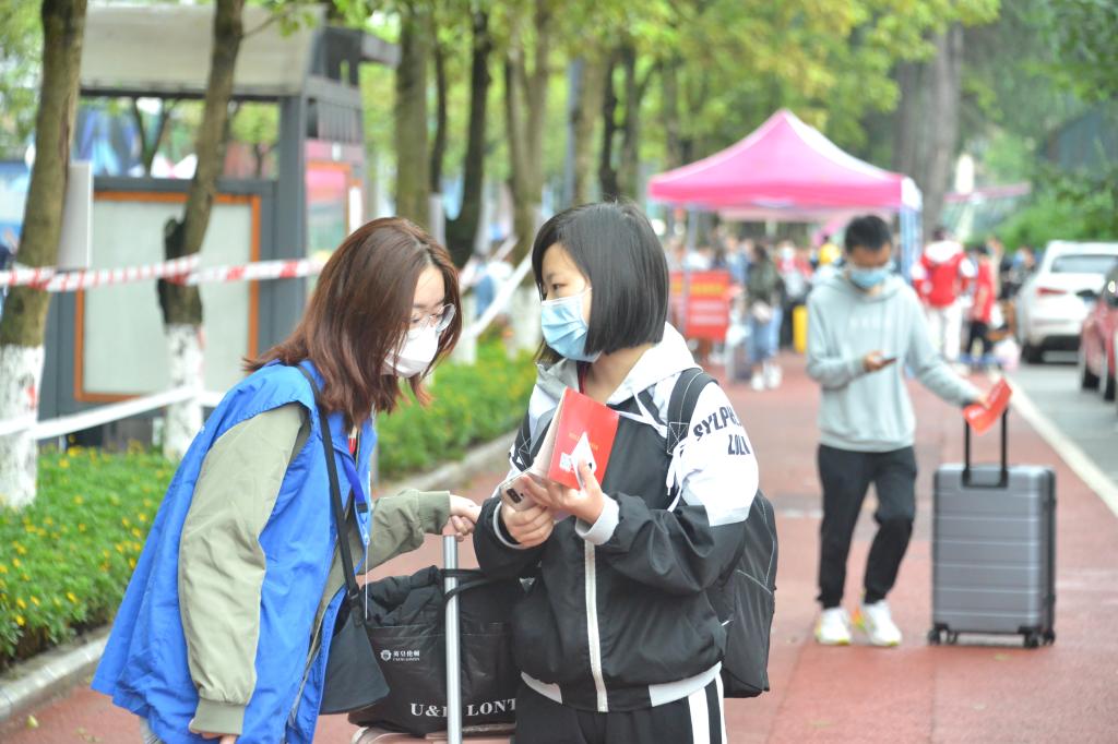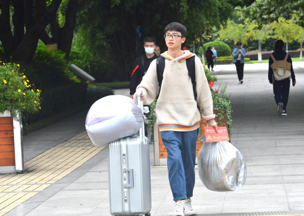 在安檢口,同學(xué)們與父母告別,走過(guò)長(zhǎng)長(zhǎng)的安檢通道,走進(jìn)校園,開啟了全新的大學(xué)生活。因?yàn)榧议L(zhǎng)不能進(jìn)入校園,新生們自己拖著行李進(jìn)校報(bào)到。校團(tuán)委、青志協(xié)、各學(xué)院志愿者熱心周到地幫助新生搬運(yùn)行李,為新生答疑解惑,讓遠(yuǎn)離家人的大一柚子感受到家的暖意。