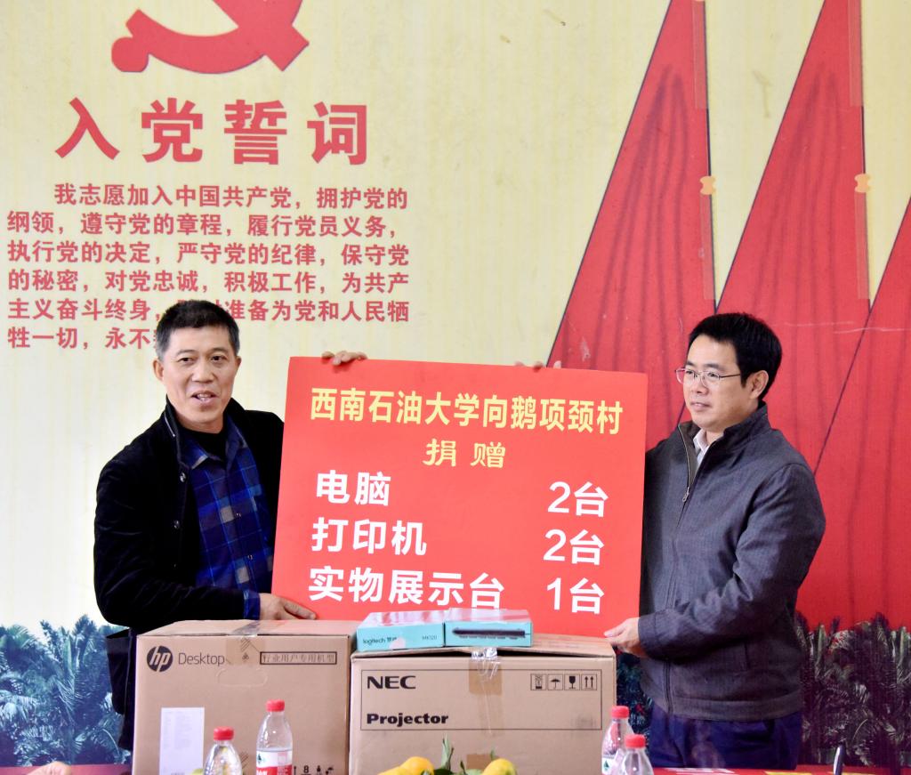 在村里的黨建活動室,趙正文認真聽取了溫登峰的幫扶工作開展情況匯報,代表學校為村上在讀大中專學生、困難兒童頒發助學金,向鵝項頸村捐贈辦公設備,包括2臺電腦、2臺打印機和1臺實物展示臺。