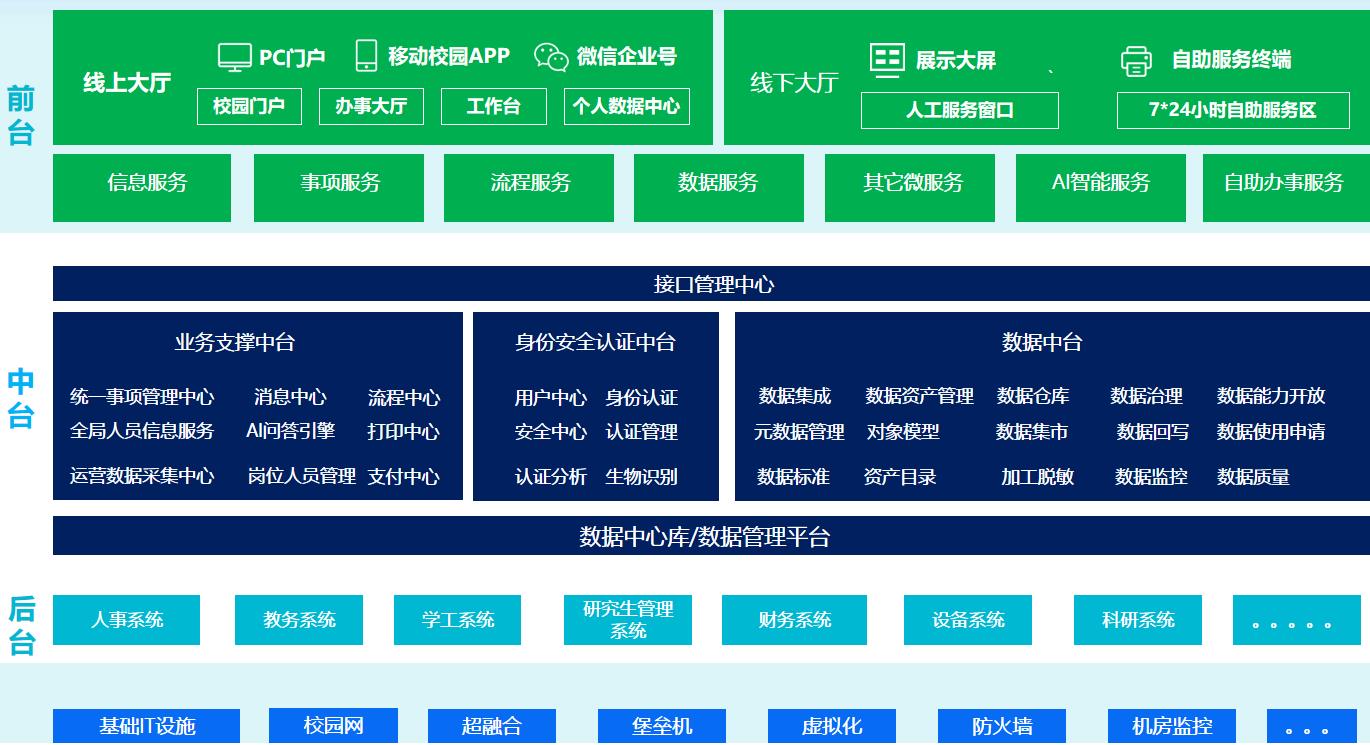 梳理出326項(xiàng)辦事指南,其中117項(xiàng)可在網(wǎng)上辦理,實(shí)現(xiàn)了讓信息多流轉(zhuǎn),讓師生少跑路;開展數(shù)據(jù)治理,打通人事、教務(wù)、學(xué)工等業(yè)務(wù)系統(tǒng),引進(jìn)機(jī)構(gòu)知識庫,建成填報(bào)系統(tǒng),解決師生重復(fù)填報(bào)的痛點(diǎn);建成全校多終端短信提醒意見反饋系統(tǒng),解決師生建議、咨詢、投訴難的問題;建成財(cái)務(wù)、后勤、學(xué)工、采購、站群等一體化平臺,實(shí)現(xiàn)了教務(wù)-財(cái)務(wù)、科研-財(cái)務(wù)、設(shè)備-財(cái)務(wù)互聯(lián)互通和會議室、開放實(shí)驗(yàn)、大精設(shè)備的網(wǎng)上預(yù)約,以及成績自助打印、繳費(fèi)、水電聯(lián)控、門禁、道閘、餐飲等物聯(lián)網(wǎng)應(yīng)用。