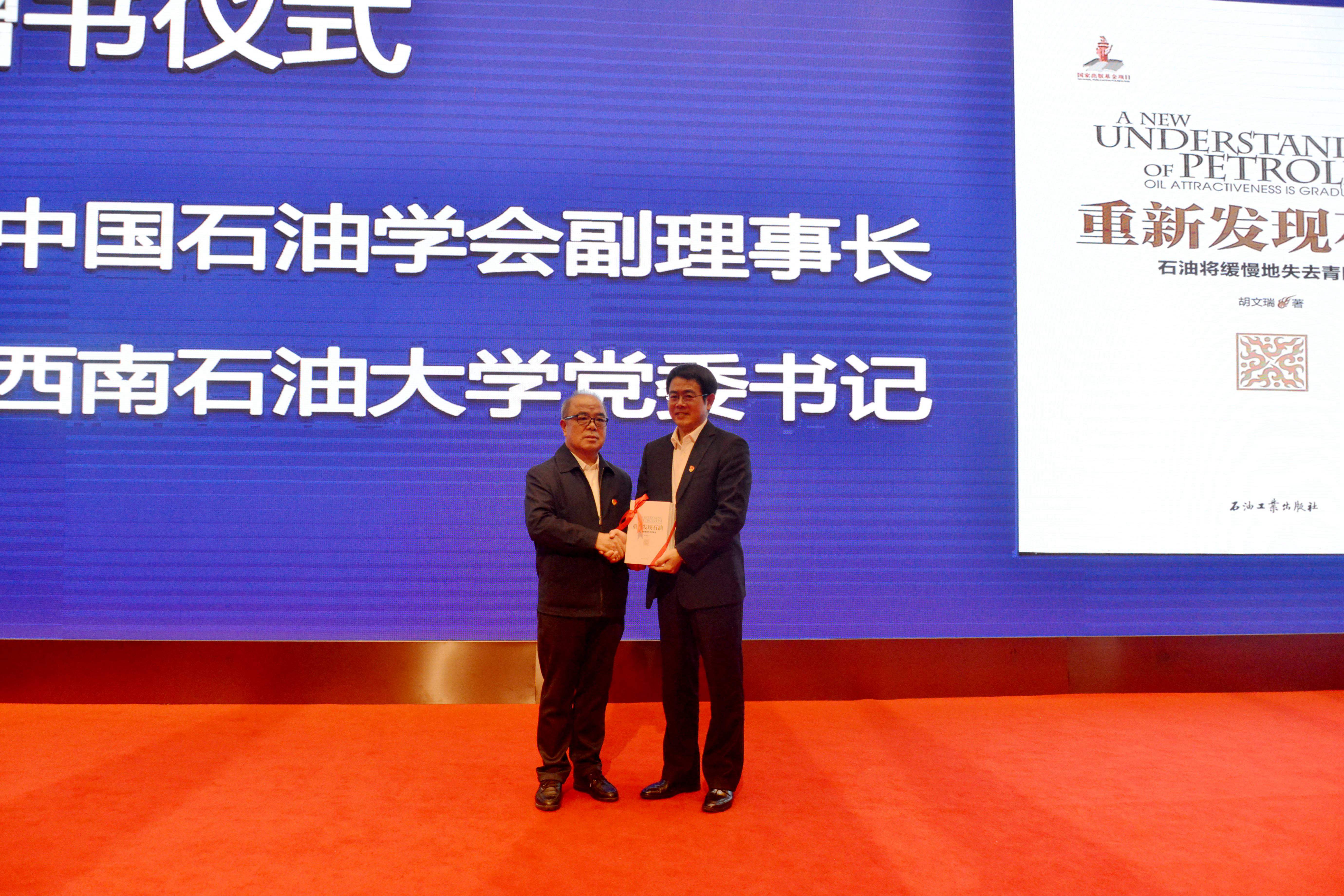 報告會上,舉行了贈書儀式,于明祥代表中國石油學會將中國工程院胡文瑞院士的著作《重新發現石油——-石油將緩慢地失去青睞度》一書贈與西南石油大學,趙正文代表學校接受了捐贈。