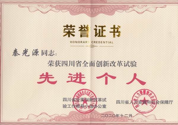 近日,科研處秦光源同志被四川省全面創新改革試驗工作領導小組辦公室、四川省人力資源和社會保障廳授予“四川省全面創新改革試驗先進個人”榮譽稱號。全省共表彰了77個先進集體和150名先進個人,其中12人來自高校。