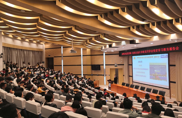 這是“春暉講堂”第四期——西南石油大學歐美同學會黨史學習教育交流報告會呈現的情景。會上,校歐美同學會副會長、全國高校“雙帶頭人”教師黨支部書記朱紅鈞教授以《中國共產黨波瀾壯闊的百年歷程》為題,為200余名師生做了一場深刻的主題報告。
