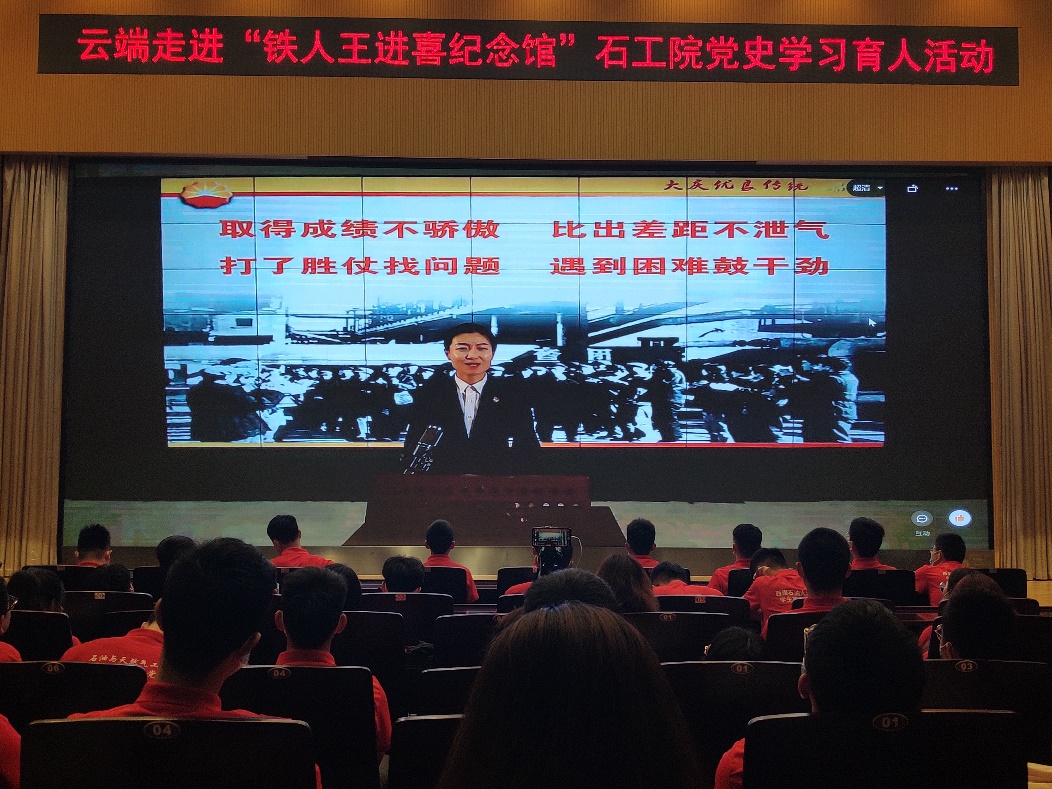 4月19日,由石油與天然氣工程學院主辦,四川省高校名團干西南石油大學石油與天然氣工程學院工作室承辦的“以史勵志,以史明德——云端走進‘鐵人王進喜紀念館’”黨史學習教育在圖書館學術報告廳舉行。石工院黨委書記張天軍致辭,院團委書記舒小立主持,線上線下共計千余名師生參加此次活動。