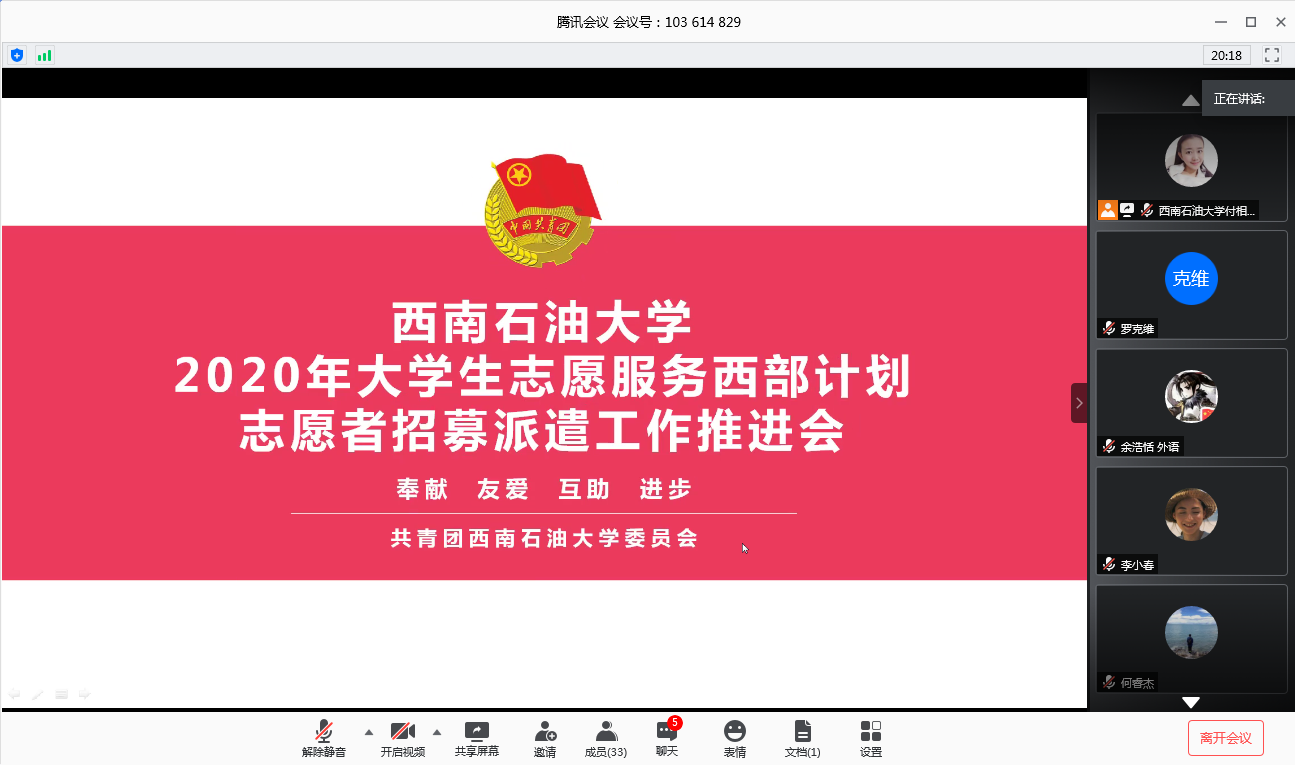 為進(jìn)一步做好大學(xué)生志愿服務(wù)西部計(jì)劃工作,號(hào)召更多青年到西部、到基層去受教育、長才干、做貢獻(xiàn),6月8日13點(diǎn),校團(tuán)委通過騰訊會(huì)議APP,線上召開我校2020年大學(xué)生志愿服務(wù)西部計(jì)劃志愿者招募派遣工作推進(jìn)會(huì)。我校報(bào)名參加西部計(jì)劃的全體志愿者參加了本次會(huì)議,會(huì)議由校團(tuán)委副書記張維主持。