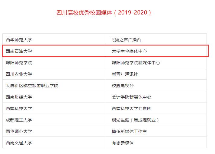 6月7日,由中青校媒(四川)主辦、中國青年報四川記者站和中青校媒指導的第十三屆中青校媒(四川)2020云端年會圓滿落幕,全省42所高校121家校園媒體參加云端會議。我校黨委宣傳部的學生團隊大學生全媒體中心榮獲2019-2020年度“四川高校優秀校園媒體”稱號。