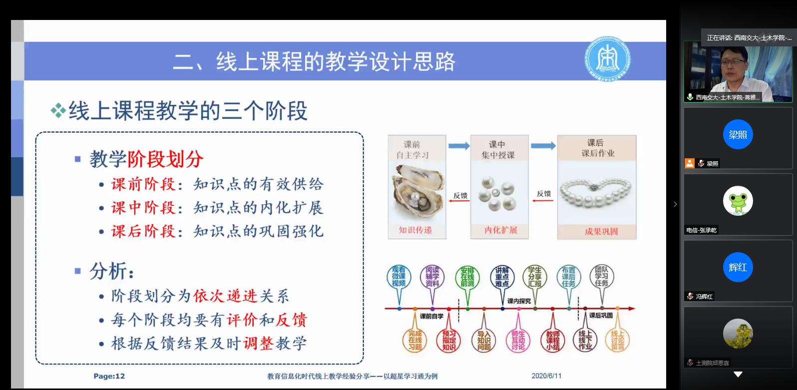 接著,來自西南交通大學的蔣雅君副教授做了題為《教育信息化時代線上教學經驗分享——以超星學習通為例》的報告。他圍繞信息化時代下的教學模式、線上課程的教學設計思路、線上課程的教學活動開展、線上課程的一些教學反思四個方面進行了生動的介紹。他指出,從傳統課堂到在線教學發生了教育形式、教學對象和教學條件等變化,作為當代的高校教師,應當做到教學理念、教學模式和教學工具的轉變,從而做到“識變、應變、求變”。