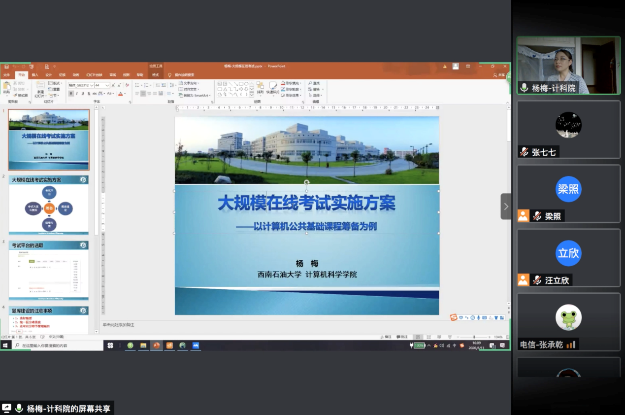 然后,我校計科院楊梅副教授圍繞《大規模在線考試實施方案》的主題做報告。她結合我校的計算機公共基礎課程考試的籌備方案,對考試平臺的選擇、考試方案與模擬、題庫建設的注意事項和試卷的組卷方案等進行了細致入微的介紹,并結合演示,對在線考試的實施方案進行了深度解讀和經驗分享。作為現階段我校在線考試人數最大的考試科目之一,計算機公共課程在線考試的實施方案對其他科目在線考試的實施具有十分重要的示范和借鑒作用。
