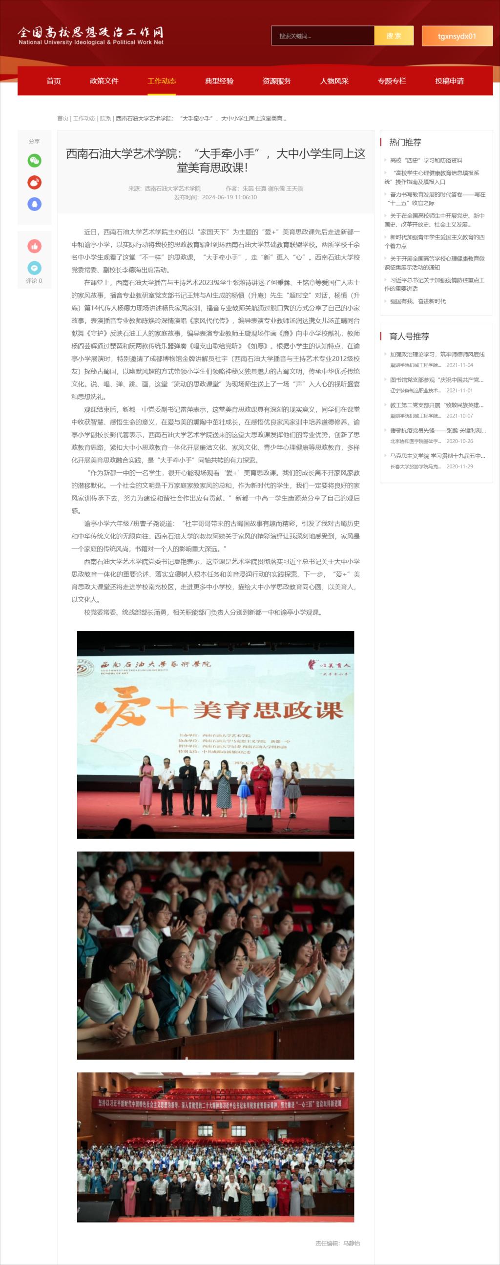 西南石油大學(xué)藝術(shù)學(xué)院黨委書記夏艷表示,這堂課是藝術(shù)學(xué)院貫徹落實(shí)習(xí)近平總書記關(guān)于大中小學(xué)思政教育一體化的重要論述、落實(shí)立德樹(shù)人根本任務(wù)和美育浸潤(rùn)行動(dòng)的實(shí)踐探索。下一步,“愛(ài)+”美育思政大課堂還將走進(jìn)學(xué)校南充校區(qū),走進(jìn)更多中小學(xué)校,描繪大中小學(xué)思政教育同心圓,以美育人,以文化人。
