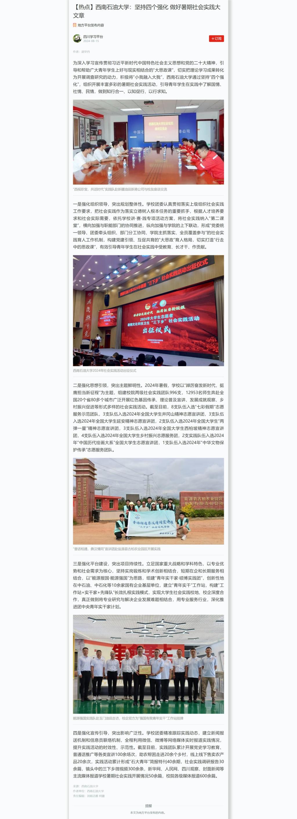 為深入學(xué)習(xí)宣傳貫徹習(xí)近平新時(shí)代中國特色社會主義思想和黨的二十大精神,引導(dǎo)和幫助廣大青年學(xué)生上好與現(xiàn)實(shí)相結(jié)合的“大思政課”,切實(shí)把理論學(xué)習(xí)成果轉(zhuǎn)化為開展調(diào)查研究的動力,積極將“小我融入大我”,西南石油大學(xué)通過堅(jiān)持“四個(gè)強(qiáng)化”,組織開展豐富多彩的暑期社會實(shí)踐活動,引導(dǎo)青年學(xué)生在實(shí)踐中了解國情、社情、民情,做到知行合一、以知促行、以行求知。