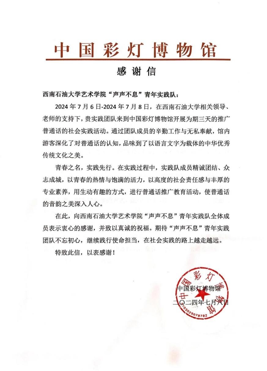 晉韻青芒展風采,聲聲不息傳佳音。“聲聲不息”青年實踐隊奔赴四川多地,開展推普實踐。他們走進社區、公園、博物館等地,將紅色文化的精神內涵融入普通話教學中,根據不同受眾的思想特點進行精準的推普宣講。團隊先后收到了來自中國彩燈博物館、自貢彩燈公園、廣元市利州生態環境局等地的表揚信,推普活動進一步激發受眾學習國家通用語言文字和自覺傳承中華優秀傳統文化的熱情。在山西太原市青年宮,晉韻青芒實踐隊不僅傳授了標準的普通話發音技巧,還通過互動體驗的方式讓參與者感受到語言文化的魅力所在。他們通過走訪調研當地普通話普及情況,制定了一系列切實可行的推普方案,一封封表揚信是對團隊推普質效的最好褒獎。