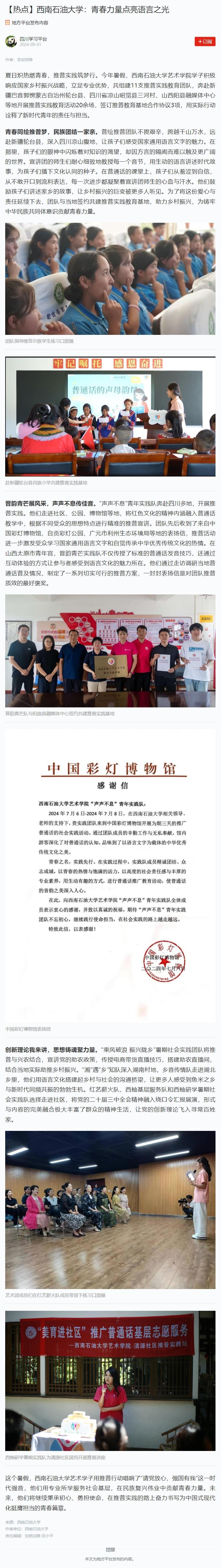 這個暑假,西南石油大學藝術學子用推普行動唱響了“請黨放心,強國有我”這一時代強音,他們用專業所學服務社會基層,在民族復興偉業中貢獻青春力量。未來,他們將繼續秉承初心、勇擔使命,在推普實踐的路上奮力書寫為中國式現代化挺膺擔當的青春篇章。