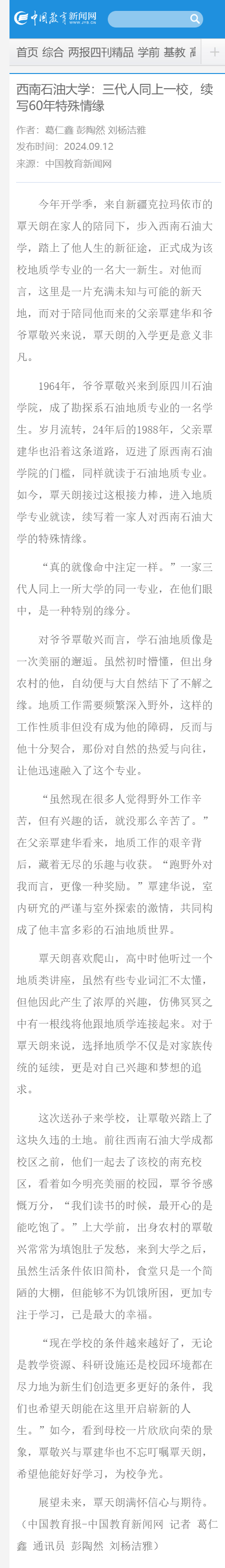《教育導報》訊(彭陶然 劉楊潔雅)9月6日,來自克拉瑪依的覃天朗在家人的陪同下,步入西南石油大學,踏上了人生的新征途,正式成為該校地質學專業的一名大一新生。對他而言,這里是一片充滿未知與可能的新天地。然而,覃天朗的入學,對于陪同而來的父親覃建華和爺爺覃敬興來說,更是意義非凡。