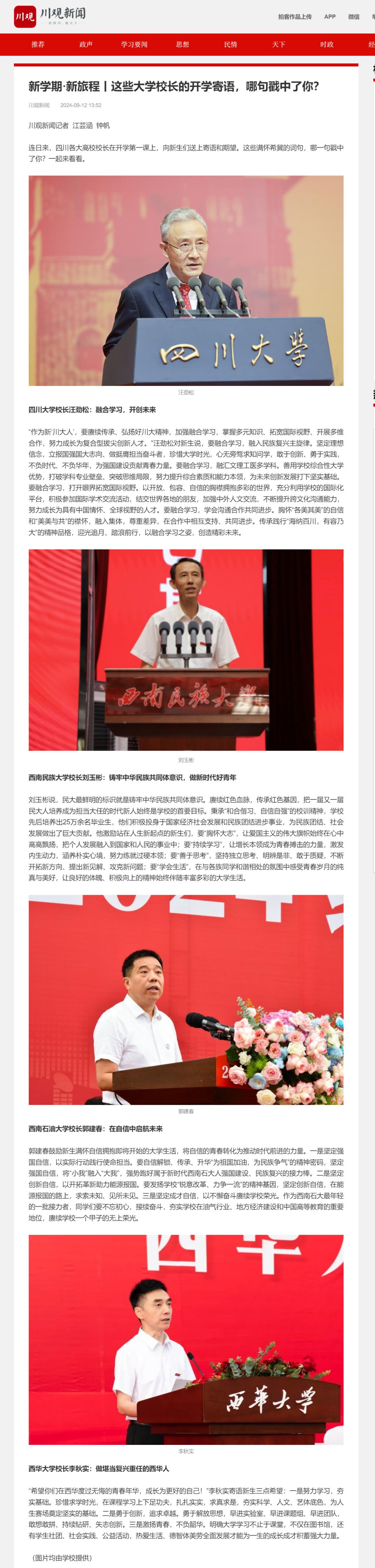 連日來,四川各大高校校長在開學第一課上,向新生們送上寄語和期望。這些滿懷希冀的詞句,哪一句戳中了你?一起來看看。