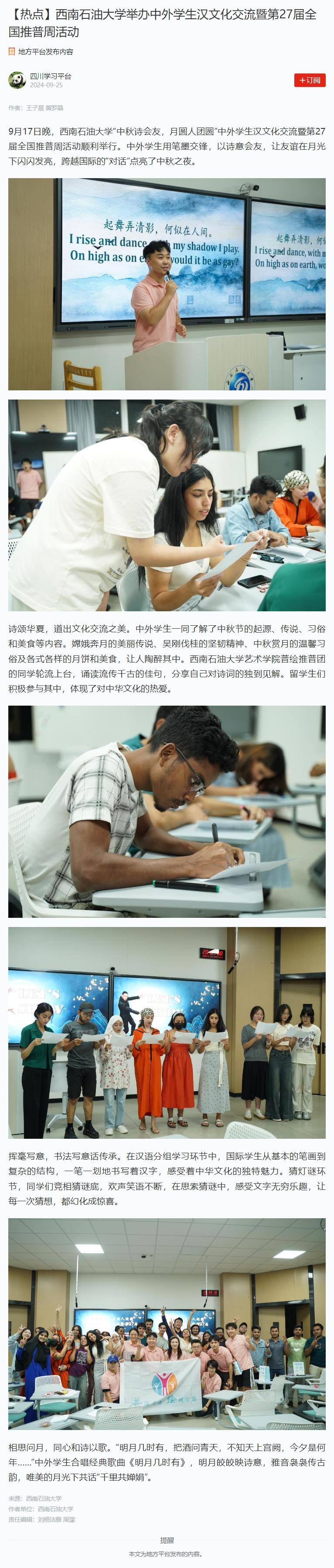 9月17日晚,西南石油大學“中秋詩會友,月圓人團圓”中外學生漢文化交流暨第27屆全國推普周活動順利舉行。中外學生用筆墨交鋒,以詩意會友,讓友誼在月光下閃閃發亮,跨越國際的“對話”點亮了中秋之夜。