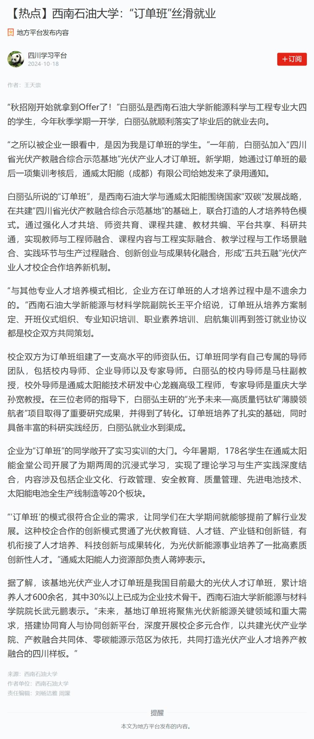 白麗弘所說的“訂單班”,是西南石油大學與通威太陽能圍繞國家“雙碳”發展戰略,在共建“四川省光伏產教融合綜合示范基地”的基礎上,聯合打造的人才培養特色模式。通過強化人才共培、師資共育、課程共建、教材共編、平臺共享、科研共通,實現教師與工程師融合、課程內容與工程實際融合、教學過程與工作場景融合、實踐環節與生產過程融合、創新創業與成果轉化融合,形成“五共五融”光伏產業人才校企合作培養新機制。