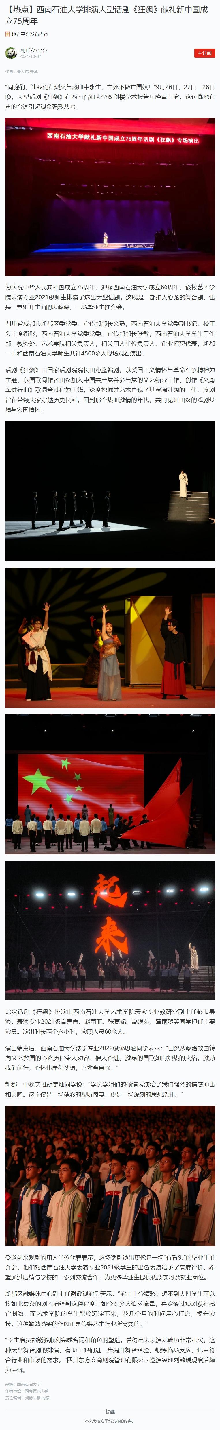 為慶祝中華人民共和國成立75周年,迎接西南石油大學成立66周年,該校藝術學院表演專業2021級師生排演了這出大型話劇。這既是一部扣人心弦的舞臺劇,也是一堂別開生面的思政課,一場畢業生推介會。