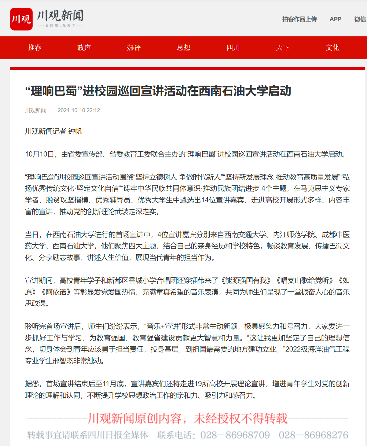 10月10日上午,“理響巴蜀”進校園巡回宣講啟動儀式暨西南石油大學(xué)專場活動在西南石油大學(xué)(成都校區(qū))舉行。