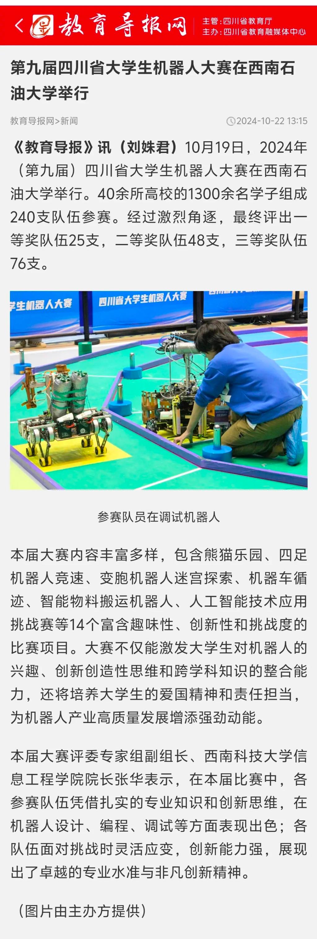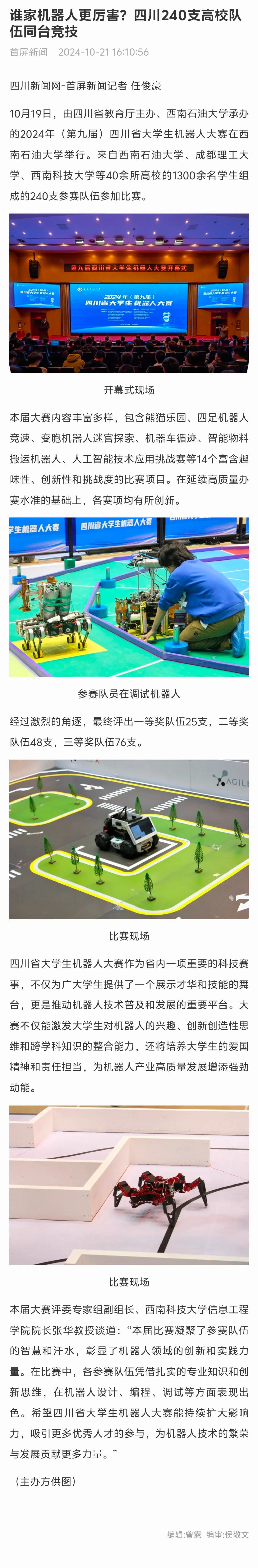 10月19日,由四川省教育廳主辦、西南石油大學(xué)承辦的2024年(第九屆)四川省大學(xué)生機器人大賽在西南石油大學(xué)舉行。來自西南石油大學(xué)、成都理工大學(xué)、西南科技大學(xué)等40余所高校的1300余名學(xué)生組成的240支參賽隊伍參加比賽。