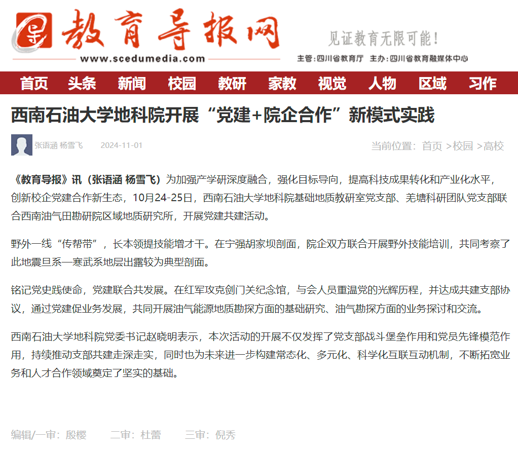 《教育導報》訊(張語涵 楊雪飛)為加強產學研深度融合,強化目標導向,提高科技成果轉化和產業化水平,創新校企黨建合作新生態,10月24-25日,西南石油大學地科院基礎地質教研室黨支部、羌塘科研團隊黨支部聯合西南油氣田勘研院區域地質研究所,開展黨建共建活動。