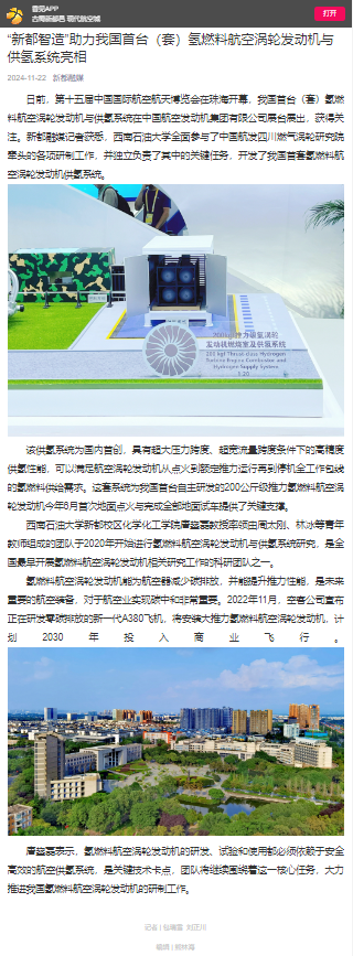 西南石油大學(xué)新都校區(qū)化學(xué)化工學(xué)院教授唐鋆磊團隊于2020年開始進行氫燃料航空渦輪發(fā)動機與供氫系統(tǒng)研究,是全國最早開展氫燃料航空渦輪發(fā)動機相關(guān)研究工作的科研團隊之一。