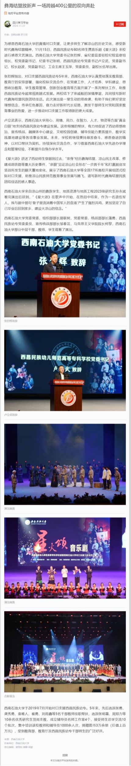 為感恩西南石油大學(xué)的真情對口支援,讓更多師生了解涼山的歷史文化,感受新時(shí)代彝海結(jié)盟精神,11月15日,西昌民族幼專80名師生攜音樂劇《星火頌》來校進(jìn)行感恩文藝演出。西南石油大學(xué)黨委書記張烈輝,省紀(jì)委監(jiān)委駐校紀(jì)檢監(jiān)察組組長、校黨委副書記、紀(jì)委書記張明,西昌民族幼專黨委書記盧立武,黨委副書記、校長趙波,黨委副書記、工會主席王玉萍,黨委委員、副校長伍琴出席。