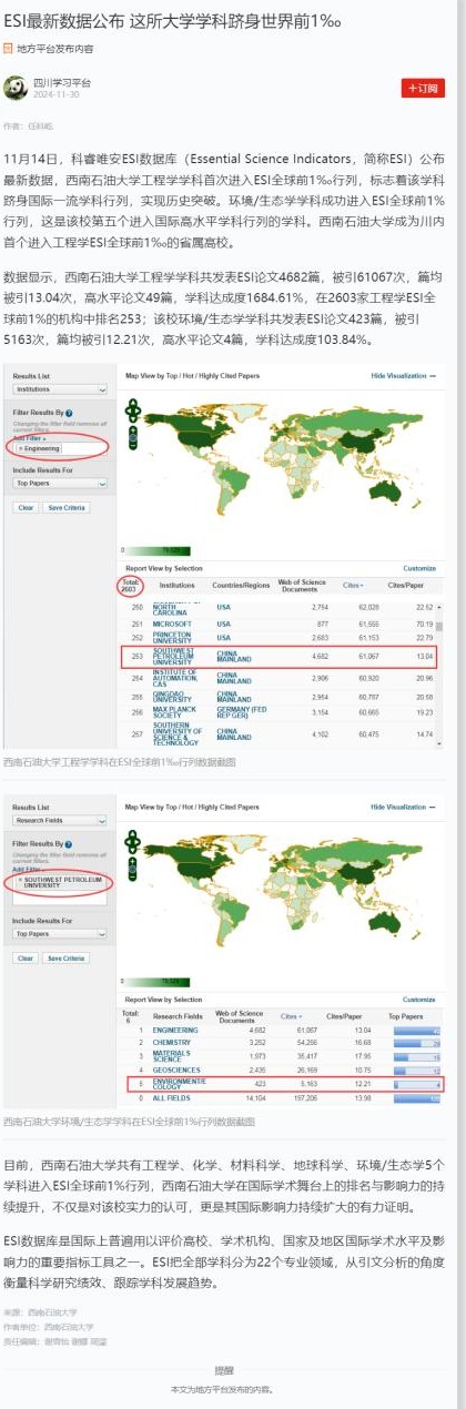 11月14日,科睿唯安ESI數據庫(Essential Science Indicators,簡稱ESI)公布最新數據,西南石油大學工程學學科首次進入ESI全球前1‰行列,標志著該學科躋身國際一流學科行列,實現歷史突破。環境/生態學學科成功進入ESI全球前1%行列,這是該校第五個進入國際高水平學科行列的學科。西南石油大學成為川內首個進入工程學ESI全球前1‰的省屬高校。