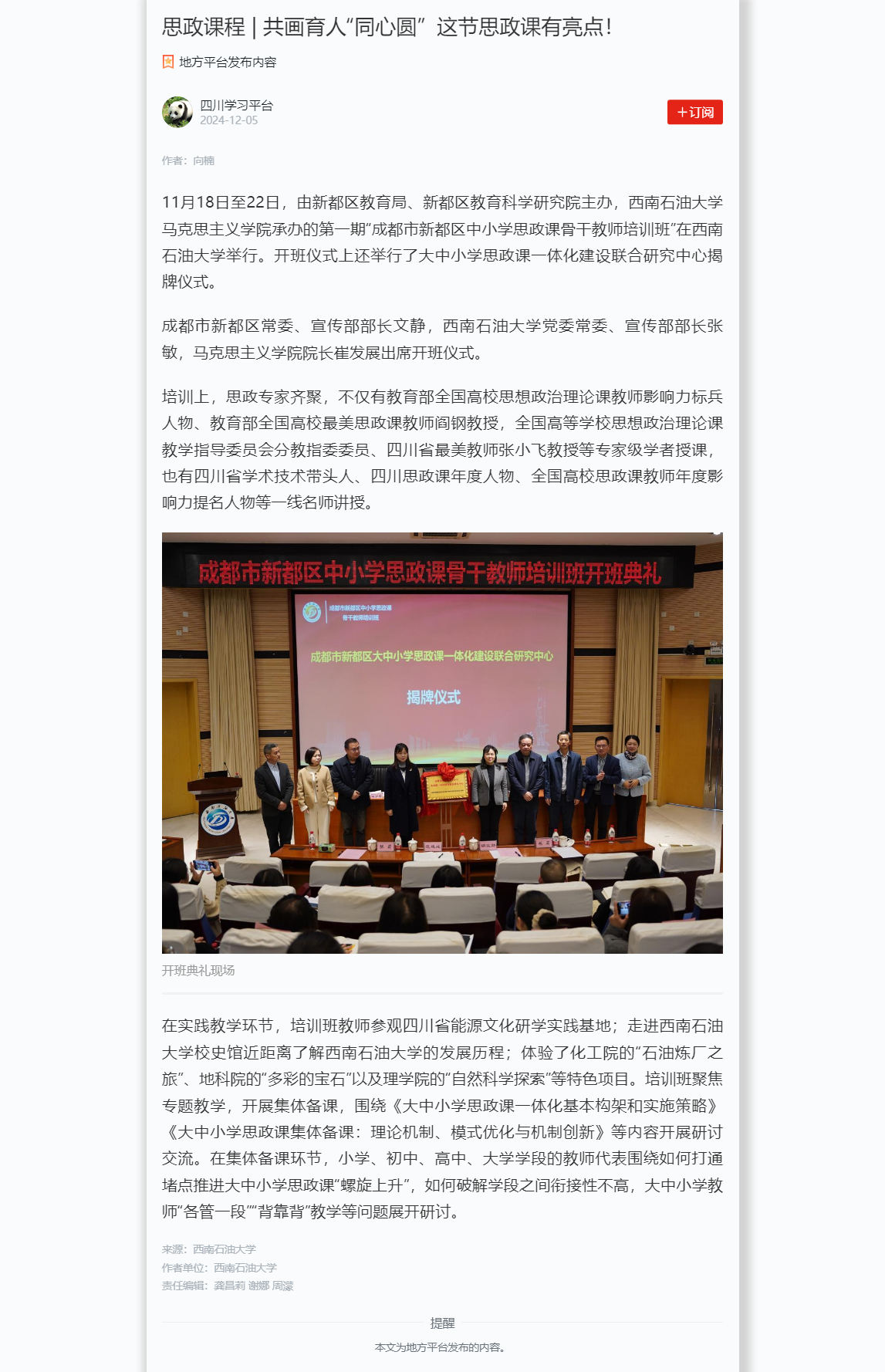 11月18日至22日,由新都區教育局、新都區教育科學研究院主辦,西南石油大學馬克思主義學院承辦的第一期“成都市新都區中小學思政課骨干教師培訓班”在西南石油大學舉行。開班儀式上還舉行了大中小學思政課一體化建設聯合研究中心揭牌儀式。